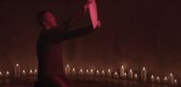 - The bedroom, where the band plays in front of a gothic bed, with a portrait of a woman with wings hanging above it. In the corner of the room is what appears to be a coat stand with a red cape and a white dress on it.