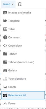If there isn't one on the page, make a new heading (H2) called References, then create a reference list below the heading by clicking Insert on the toolbar, then References list.